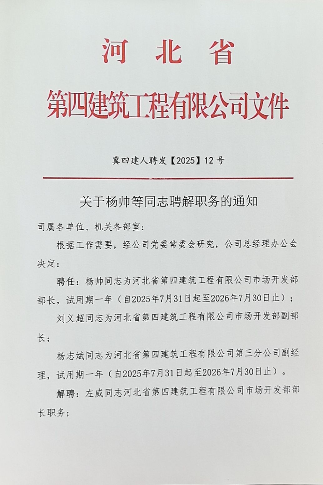 河北四建:关于刘宇等同志聘解职务的通知